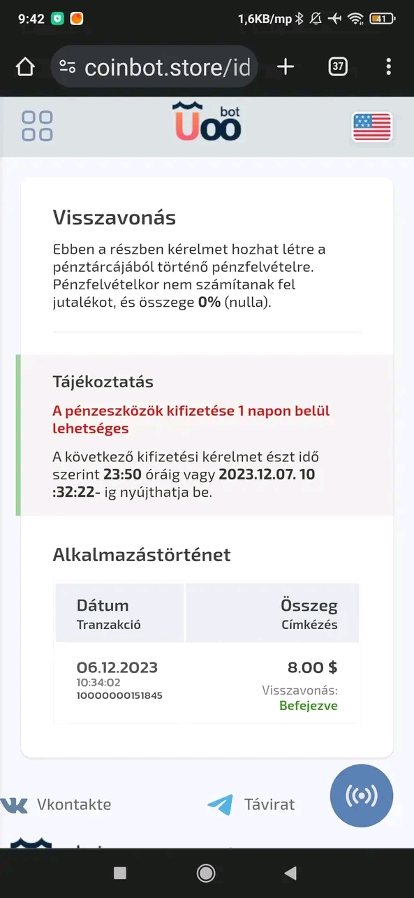 Viszont 1 bitcoin befizetésem nem érkezett meg. Hiába írtam a support@uoobot.store címre, ez visszapattant nincs ilyen cím.