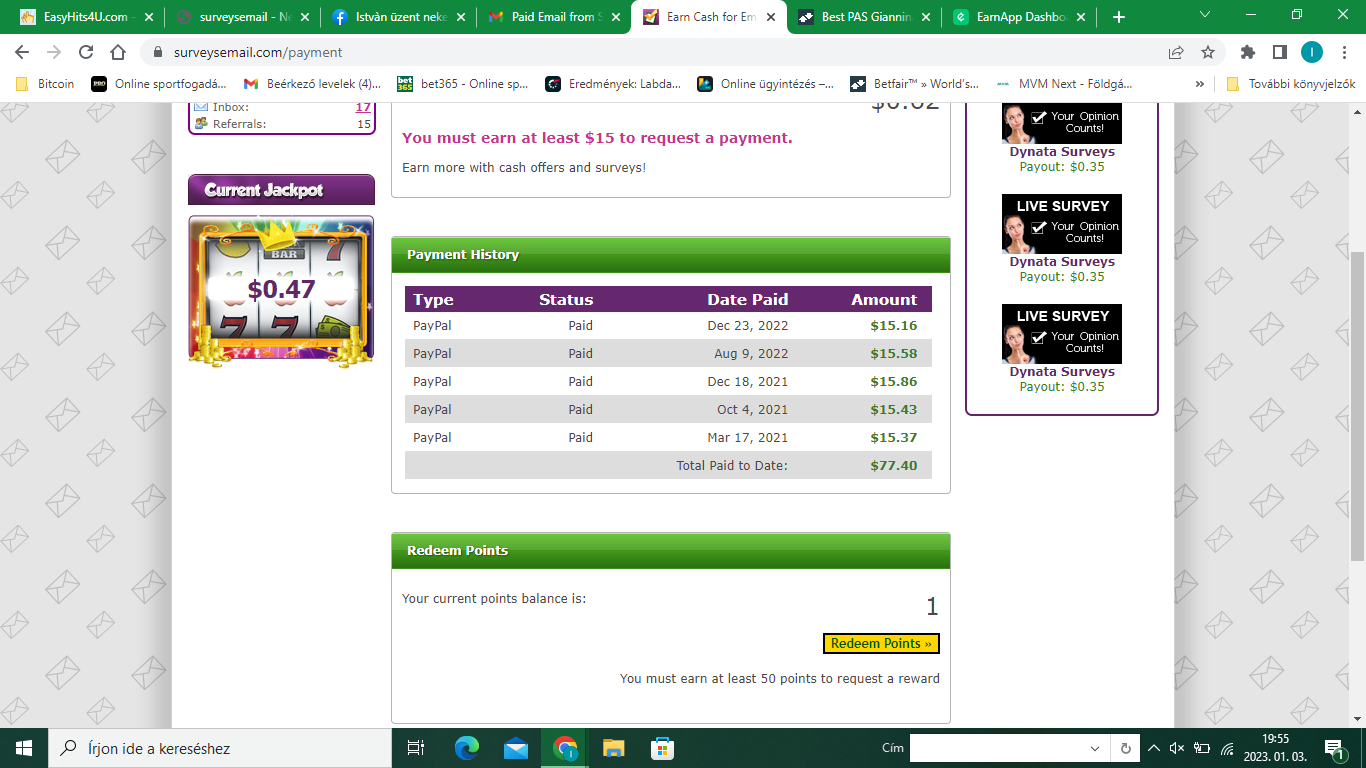 Ki is tudtam kérni (15,47 dollár), remélem marad ez a tempó. Tegnap-tegnapelőtt 6 kérdőívet sikerült. (7-ket meg kellett szakítanom).