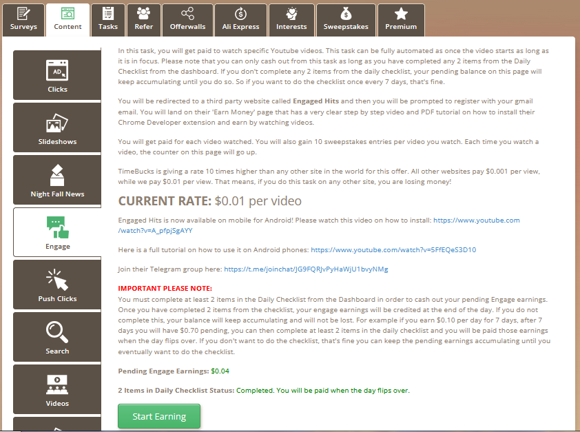 A TimeBucks magyar kérdőíveket küldő, de angol felületű oldal. A kérdőívek mellett mikromunkákra is lehetőség van (más oldalakról már ismerős offerwall ajánlatok használatával, de vannak captcha gépelések, pénzért videónézés meg hasonló ajánlatok is), illetve ha legalább 10 ajánlatot teljesítesz, akkor minden nap lehetőséged van akár $100-t nyerni az Earn / Roll menüpontban (minden játék nyer valamennyit).